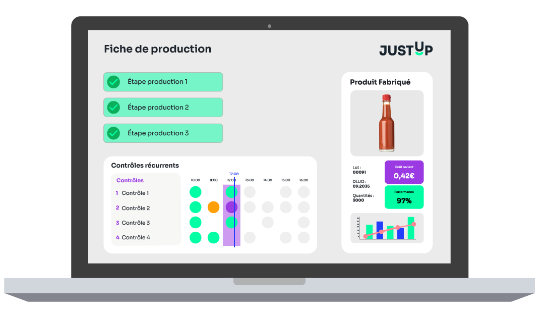 JustUp simplifie la vie des opérateurs, sécurise vos process et vous fait gagner du temps au quotidien. Une interface conçue avec des spécialistes de l’agroalimentaire pour guider vos équipes simplement et efficacement. Vos contrôles deviennent fluides, vos audits plus simples, et vos productions plus fiables.